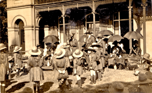 Comparing other photos, it appears that this may have been taken at Abergeldie, the home of Sir Hugh Dixson and his wife Emma Elizabeth Dixson who were avid supporters of the Guide and Scout movement in Dulwich Hill. Lady Dixson having been inspired after attending Lord Baden Powell’s troop displays in London. (See Trove Article). Mrs Dixson had her “Own Troop” and built headquarters for them at Lewisham Street, Dulwich Hill in 1921.