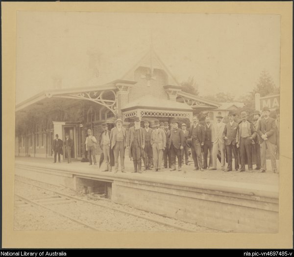 | nla.pic-vn4697485 Kimbel, Wilhelm Group portrait including Henry Deane at Marrickville station, Sydney, ca. 1890s [picture]. 189-. 1 photograph : sepia toned ; 19.5 x 23.5 cm., on mount 22 x 26 cm. Part of Henry Deane collection of photographs [picture]. [ca. 1880-ca. 1940] |