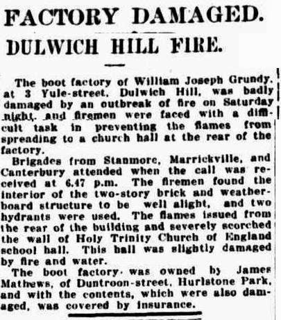 We reported last year about the sad loss of the Holy Trinity Parish Hall. Though many may not know that the church was almost lost 87 years before. A boot factory in Yule Street caught alight which caused scorching to the wall of the Holy Trinity Church school hall. Had it caught alight it is quite probable that the church would have gone too. Both the church and school hall have now been demolished.