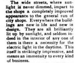 The wide streets, where sunlight is never dimmed, impart to the shops a completely improved appearance to the general run of city shops. Everywhere the buildings are new in life and new in design. They are all brilliantly lit up by sunlight, and seldom indeed in the interior of any one of them is there a necessity for the electric light in the daytime. This itself is strikingly impressive, and means an immensity to every kind of business.