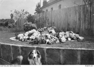 The photo captures the memorial plaque and floral tributes in the backyard of the family home of RAAF Flight Sergeant Jack Wormald, No. 466 Squadron, c. 1944–1947. (38 Terrace Road, Dulwich Hill.) Inscribed on the plaque were the words ‘A tribute to the memory of our beloved son Flight Sergeant Jack Dudley Wormald RAAF and his crew lost over Berlin Feb 15th 1944, aged 21 years. God gave thy brave soul wings. My Son. My Son’. The dog had belonged to Jack Wormald.