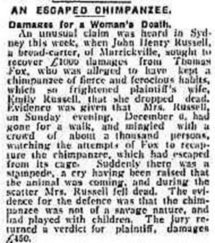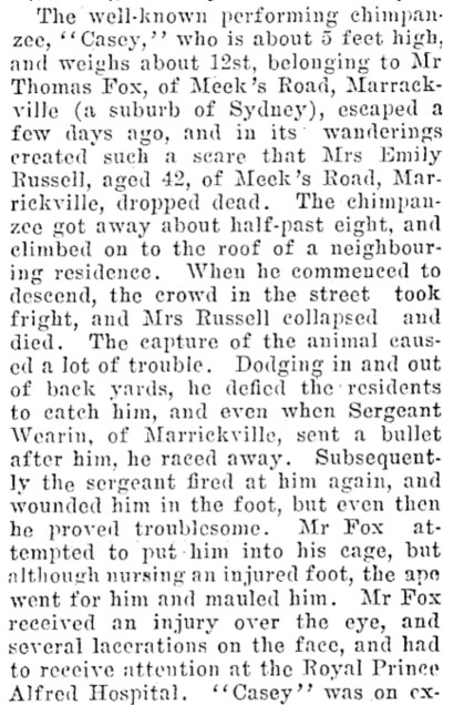 An unusual incident on the night of the 6th of December 1915 caused quite a disturbance among the residents of Marrickville. Mrs. Emily Russell, a local to the area, died during the pursuit of an escaped performing chimpanzee named “Casey”. The event was detailed with great zest in a New Zealand local newspaper several days later (sandwiched between a notice from the postmaster and an advertisement for the display of exotic wares):