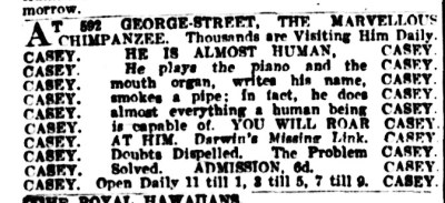 Casey belonged to a Mr. Thomas Fox, and before this incident was widely advertised in Australian papers as a spectacle to which visitors, for a price of 6p, could purportedly come to see with their own eyes Darwin’s “missing link”.