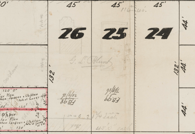 Extreme close up of sale poster showing the purchases of George Lynch Blunt and the outline of the buildings he erected.