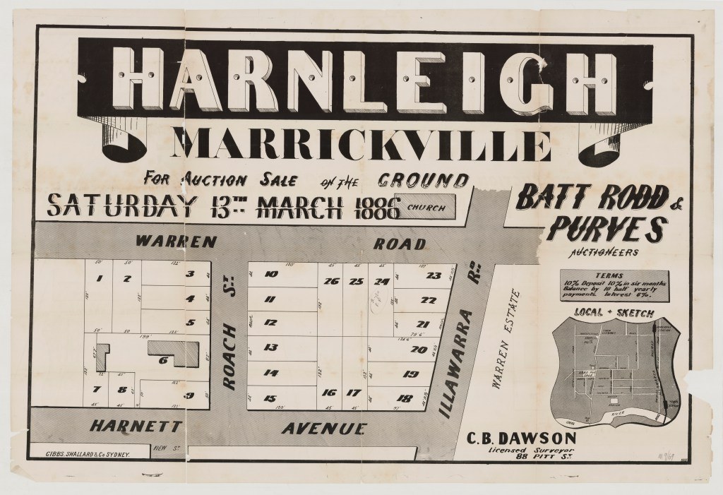 Third Harnleigh Sale. The house, ‘Harnleigh’, and stables at left. 50 and 52 Warren Road are lots 26 and 25. Thomas Holt’s Warren Estate on right. Thomas Roseby’s church at top.