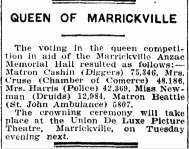 Alice became a member of the Marrickville Anzac Memorial Club (demolished) in Garners Avenue shortly after it was founded in 1921. Alice may well have been one of its most highly decorated members. Certainly, she was extremely popular. The Club had cost over £3000 to build and was paid for by public donations, by 1924 it still owed about £2000. It was decided to hold a fund-raising competition to find the “Queen of Marrickville”.