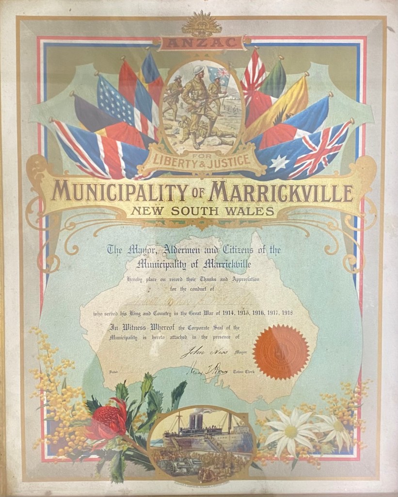 Marrickville Council had erected a monument to the dead and issued certificates of appreciation to the soldiers and their families. Returnees marched at the head of the parade at the opening of the new town hall. Along with the cenotaph, the new town hall also had a captured German gun on the forecourt.