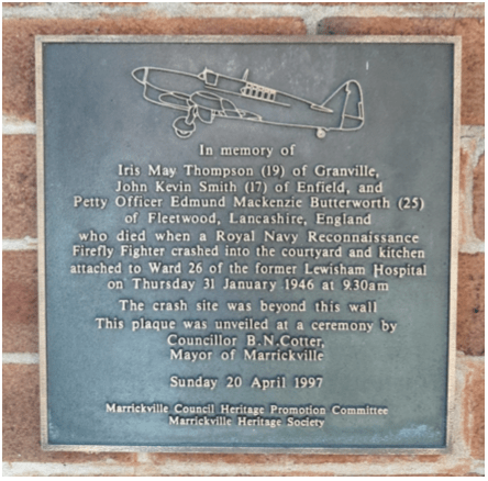 Publicity about the Petersham disaster brought to light a 1946 air crash. This time a plane crashed into Lewisham Hospital, killing the plane’s observer and two young workers from the hospital kitchen. Iris Thompson was 19 years old and Jack Smith was 17. MHS member Richard Blair took up the task of recognition. MHS held a commemoration on the 50th anniversary and liaised with Marrickville Council to produce a memorial plaque. This was unveiled in 1997 by deputy mayor Carmel Tebbutt.
