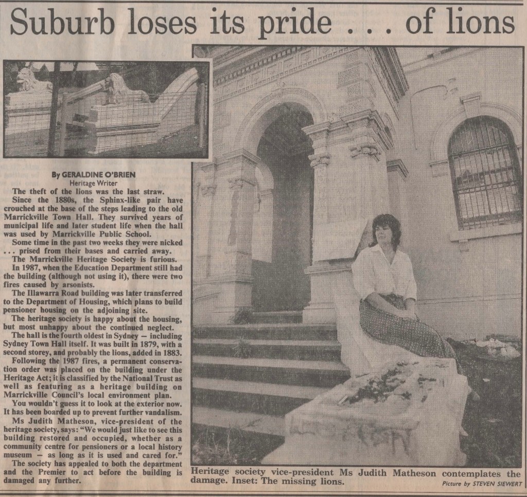 However, they were unable to stop the theft of two ceramic lions that sat on pedestals at the entrance to the hall. These were removed in broad daylight and have not been seen by Marrickville residents since 1990.