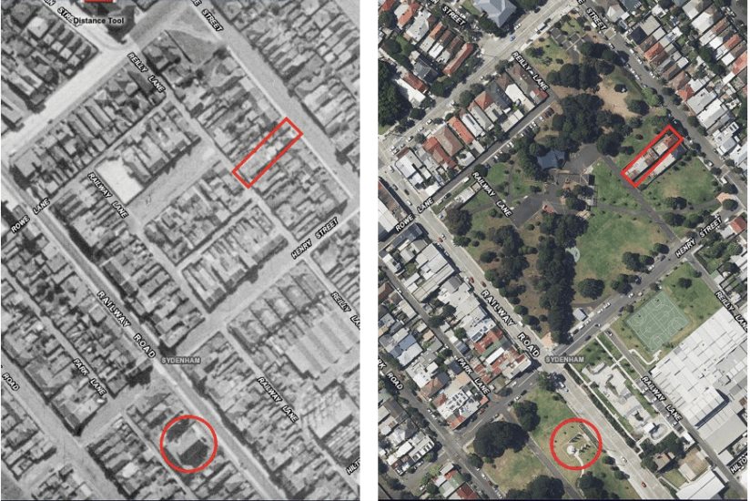 Aerial views from 1943 and 2024 showing the homes lost due to aircraft noise from the third runway. The circle at the bottom shows the Coptic Orthodox Church site and its ‘remembrance’. The rectangle at the right is the home of Harry and Del Stone in George Street.