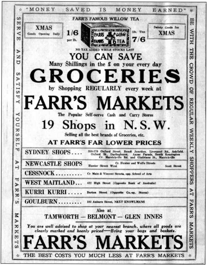 Farr’s Markets had started in Newcastle in 1923 and quickly grew in regional NSW. They moved to Sydney, starting in Bondi Junction in 1925. Farr’s represented a new type of retail store known as ‘Cash and Carry’ grocery stores.
