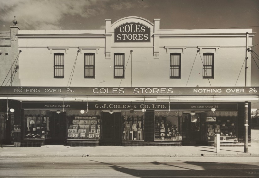 By this time, Farr’s had a new neighbour who gradually encroached on their site as they ‘downsized’, then closed. This was G. J. Coles and Company which had started in Melbourne in 1914. They leased part of the building in 1936 and opened their Number 37 store. Initially, Coles stores did not sell groceries – they were general traders selling clothing, footwear, haberdashery and other everyday items promising nothing over 2 shillings and 6 pence.
