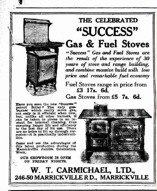 William Carmichael’s business making cast iron stoves and grates was hugely successful, winning awards and praise from many, and he rather cheekily named his stove range “Success.” By 1927 the business was too big and he moved it to Auburn while continuing to live on Wardell Road, Dulwich Hill. His house “Cloonkell” (an area in County Galway, Ireland) has gone, now part of St Maroun’s School.