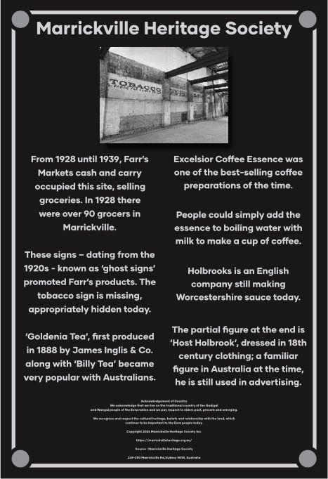 Several years ago, during the refurbishment of 248-250 Marrickville Road, Marrickville Heritage Society (MHS) committee member Iain Carolin spied a number of signs on an internal wall – ‘ghost signs’.