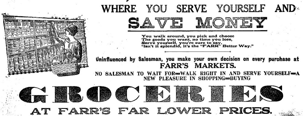 This description is very familiar today. This type of store was the beginning of the supermarket. In fact, Farr’s Markets Ltd has been cited as the first to use the term ‘super market’ in Australia.