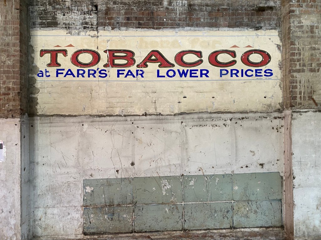 This sign has been covered up, probably for the best in today’s world. It is interesting that Farr’s did not advertise particular tobacco brands, although they did for cigarettes. They do use one of their catch phrases in the promotion; “Farr’s far lower prices.” In November of 1930 thieves broke a pain of glass on the roof, entered the store and stole £150 of tobacco. Farr’s must have kept quite a lot of tobacco on the premises.