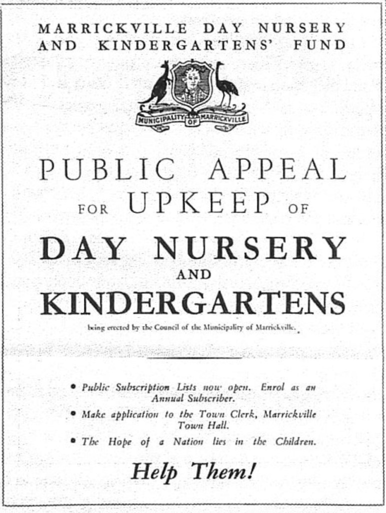 This led to council forming the Marrickville Day Nursery and Kindergarten Committee to build, maintain and fund the nursery and kindergartens in our area.